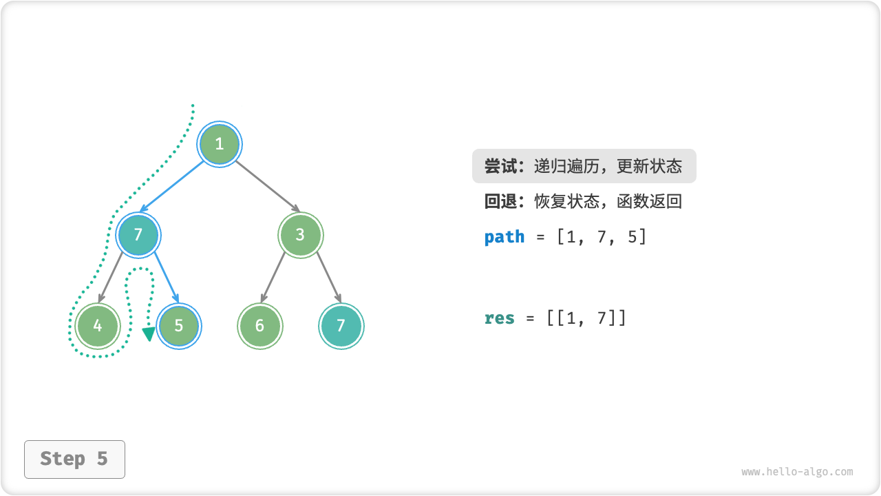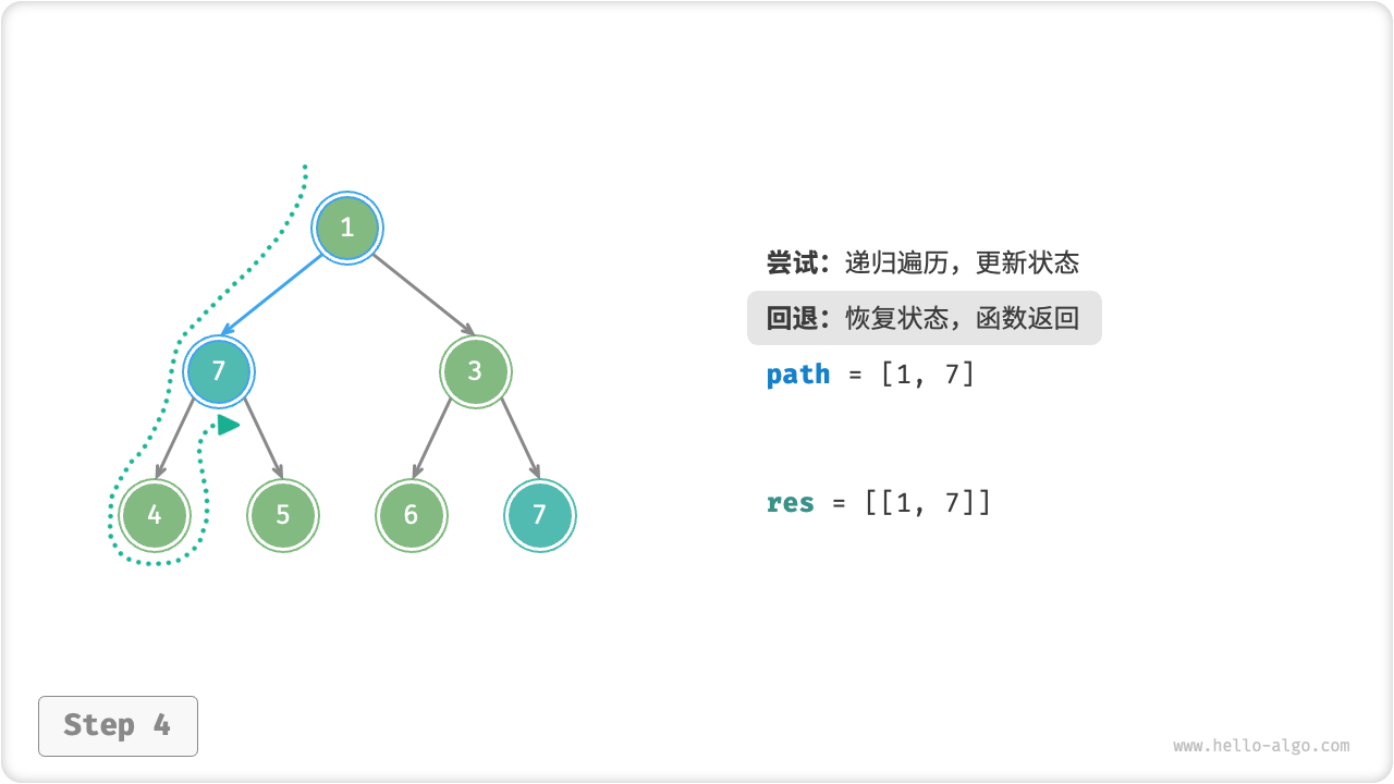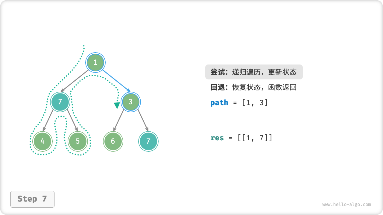 | 尝试 Attempt | 尝试是根据可用选择来探索解空间的过程,包括做出选择,更新状态,检查是否为解 | 递归访问左(右)子节点,将节点添加进 path ,判断节点的值是否为 \(7\) |