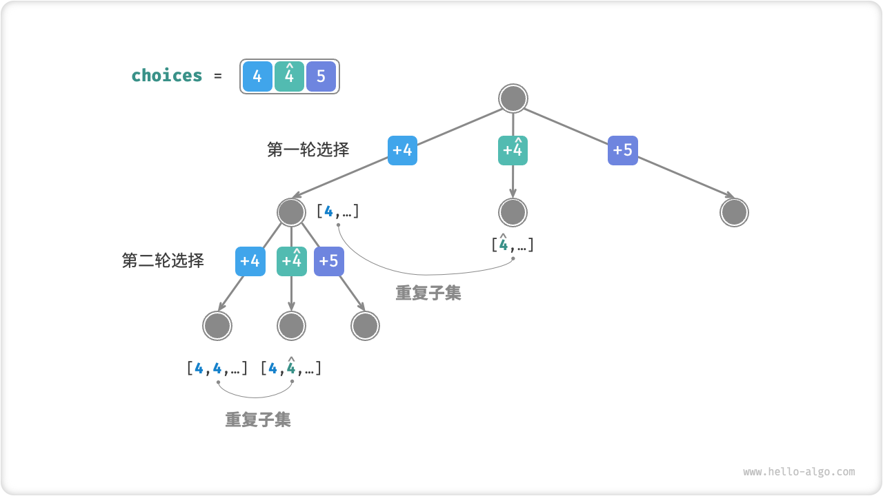 相比于上题,本题的输入数组可能包含重复元素,这引入了新的问题。例如,给定数组 \([4, \hat{4}, 5]\) 和目标元素 \(9\) ,则现有代码的输出结果为 \([4, 5], [\hat{4}, 5]\) ,出现了重复子集。