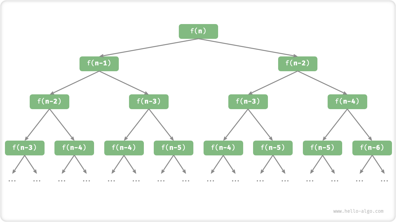 观察以上代码,我们在函数内递归调用了两个函数,这意味着从一个调用产生了两个调用分支。如下图所示,这样不断递归调用下去,最终将产生一个层数为 \(n\) 的「递归树 recursion tree」。