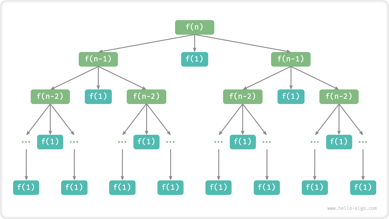 如下图所示,汉诺塔问题形成一个高度为 \(n\) 的递归树,每个节点代表一个子问题、对应一个开启的 dfs() 函数,因此时间复杂度为 \(O(2^n)\) ,空间复杂度为 \(O(n)\) 。
