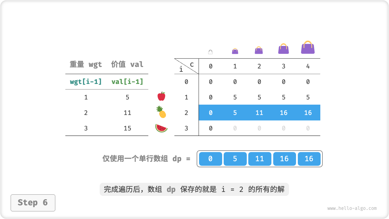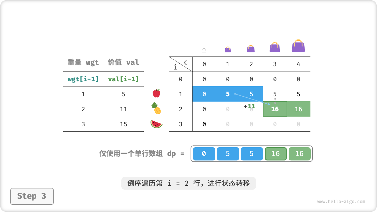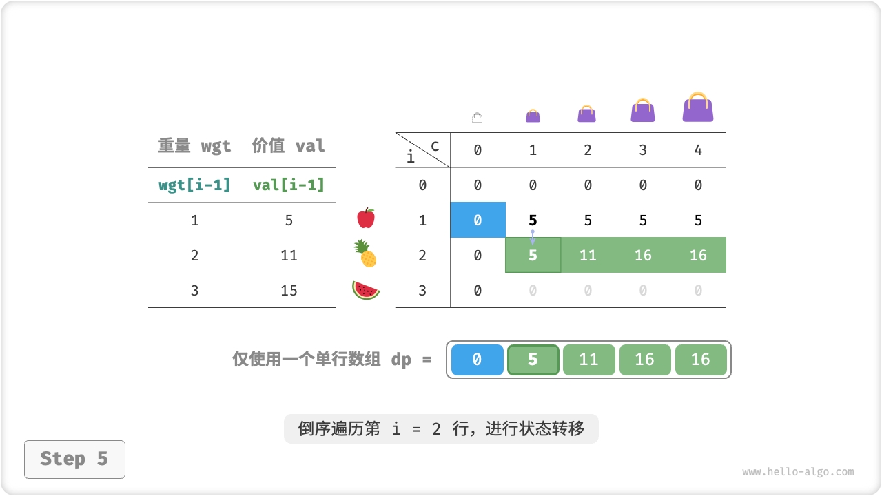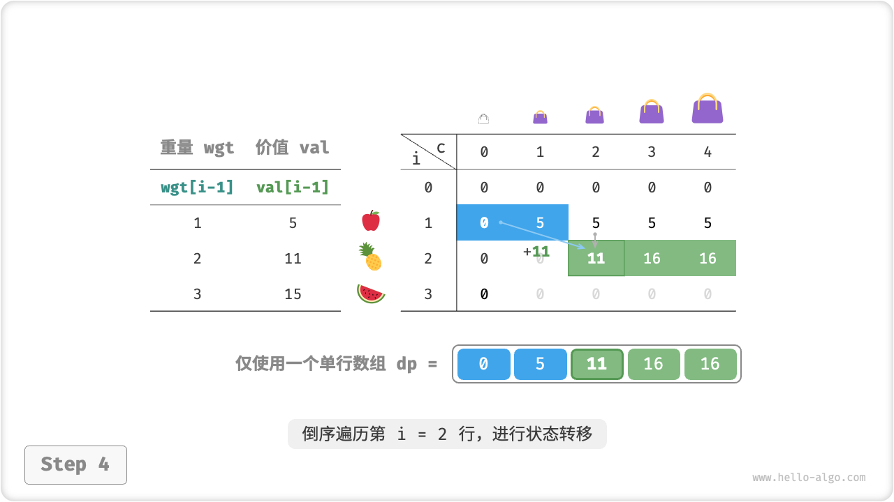 下图展示了在单个数组下从第 \(i = 1\) 行转换至第 \(i = 2\) 行的过程。请思考正序遍历和倒序遍历的区别。