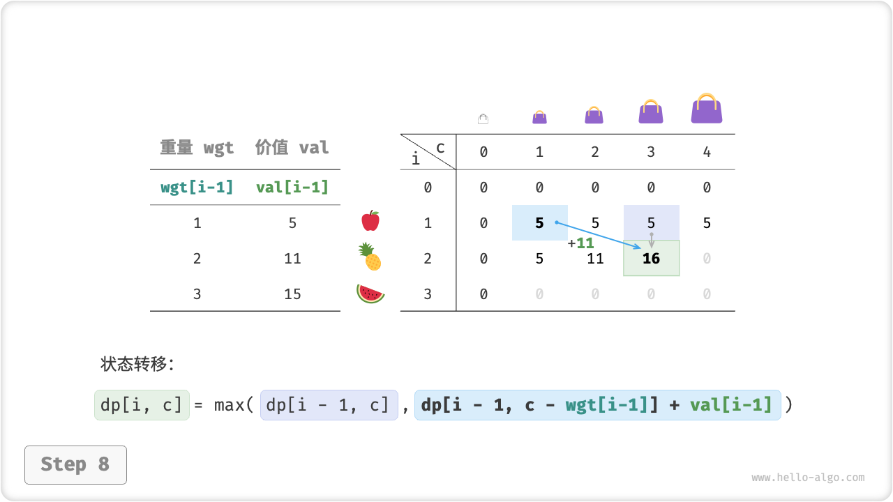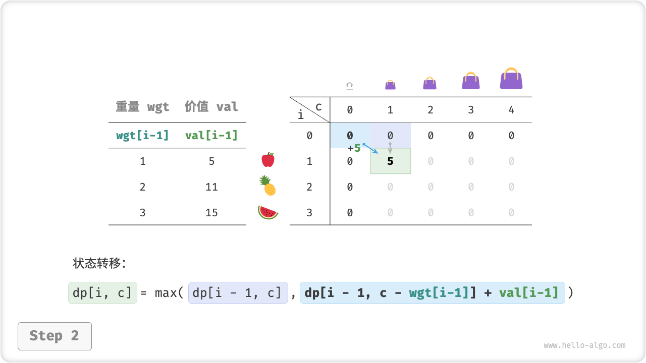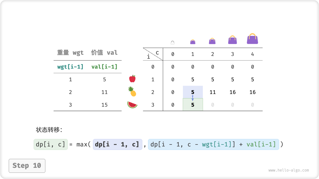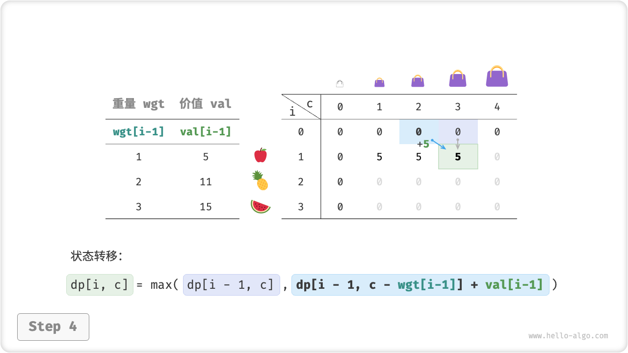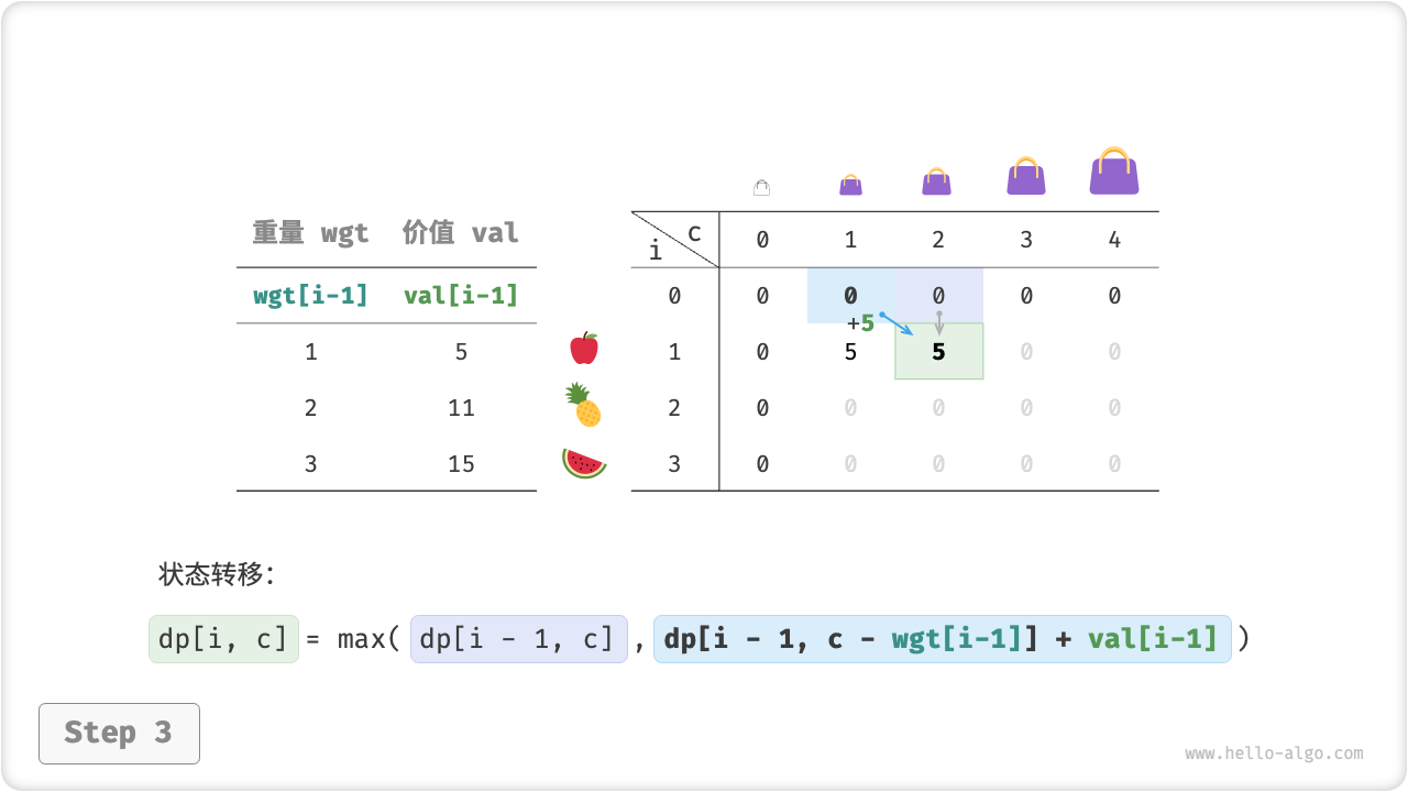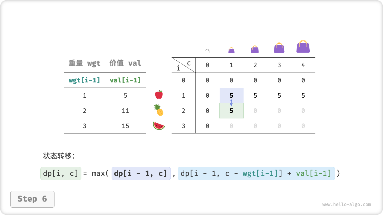 上述分析向我们揭示了本题的最优子结构:最大价值 \(dp[i, c]\) 等于不放入物品 \(i\) 和放入物品 \(i\) 两种方案中的价值更大的那一个。由此可推出状态转移方程: