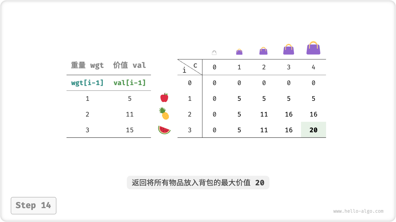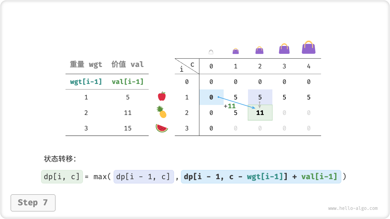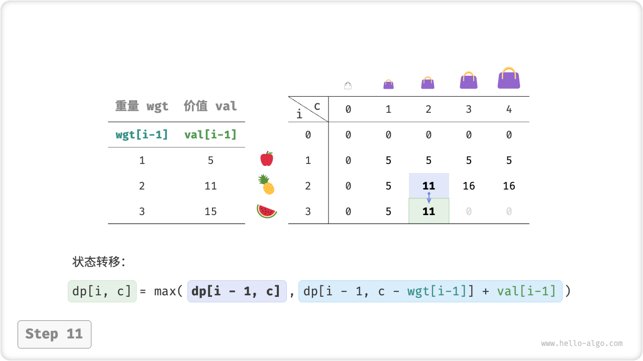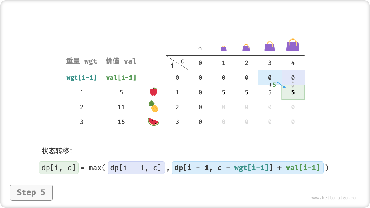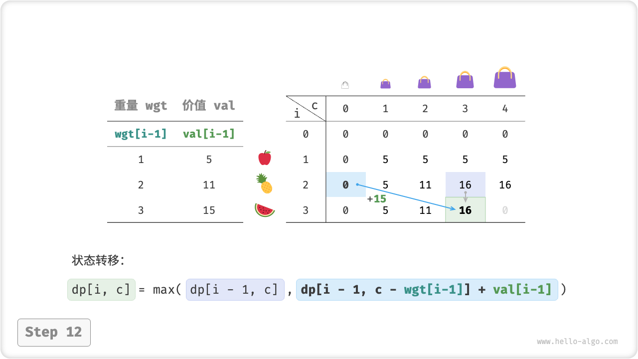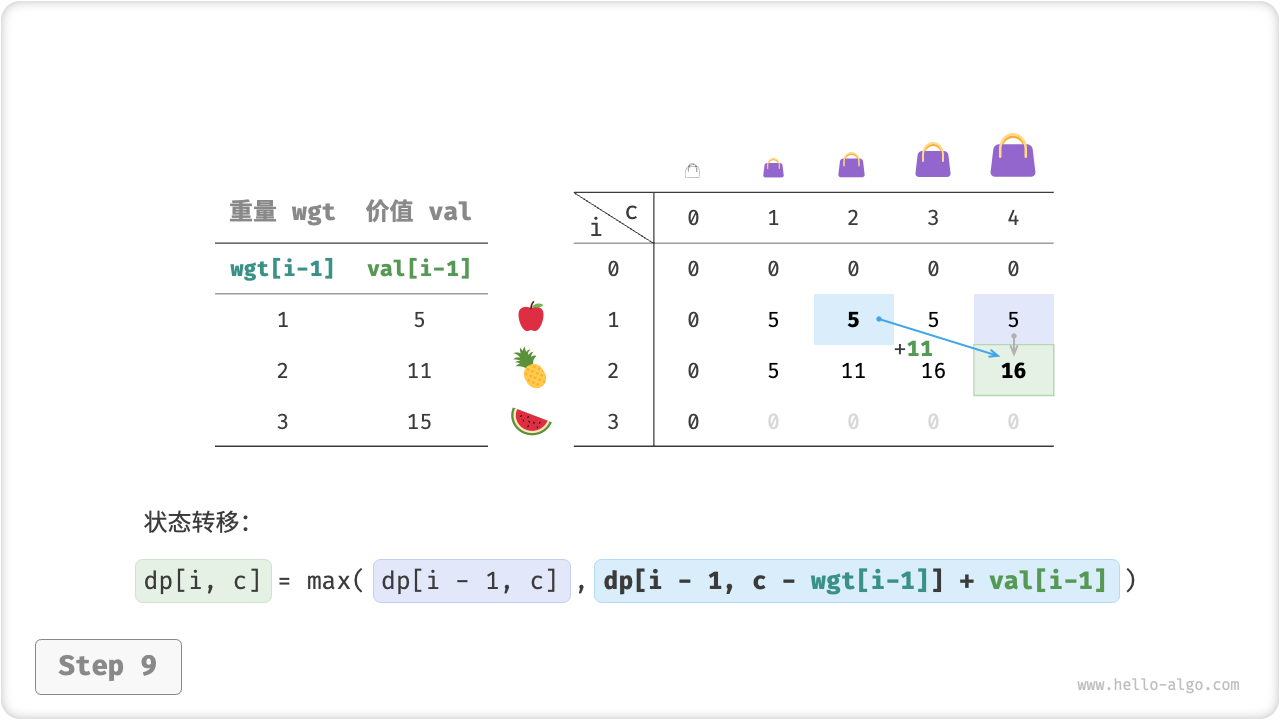 上述分析向我们揭示了本题的最优子结构:最大价值 \(dp[i, c]\) 等于不放入物品 \(i\) 和放入物品 \(i\) 两种方案中的价值更大的那一个。由此可推出状态转移方程: