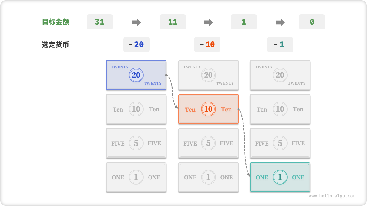 - 完成找零,方案为 \(20 + 10 + 1 = 31\) 元。