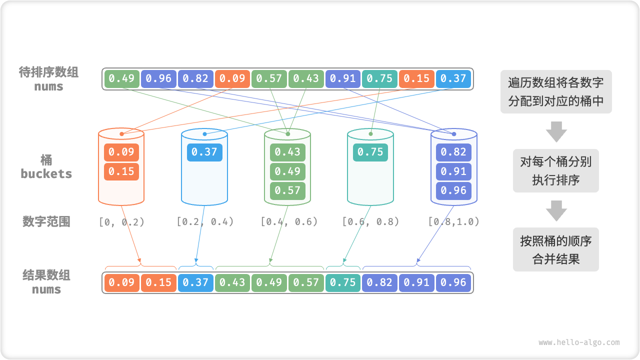 「桶排序 bucket sort」是分治策略的一个典型应用。它通过设置一些具有大小顺序的桶,每个桶对应一个数据范围,将数据平均分配到各个桶中;然后,在每个桶内部分别执行排序;最终按照桶的顺序将所有数据合并。