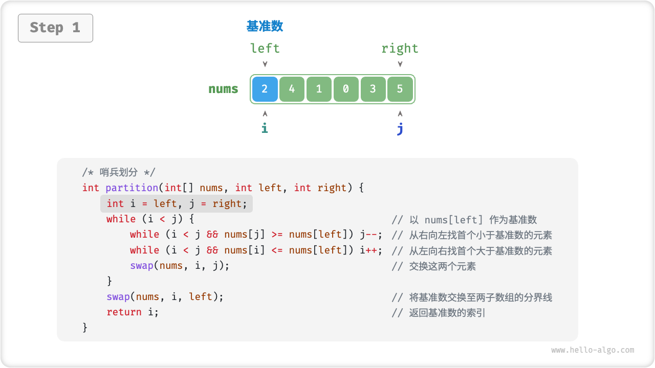 - 选取数组最左端元素作为基准数,初始化两个指针