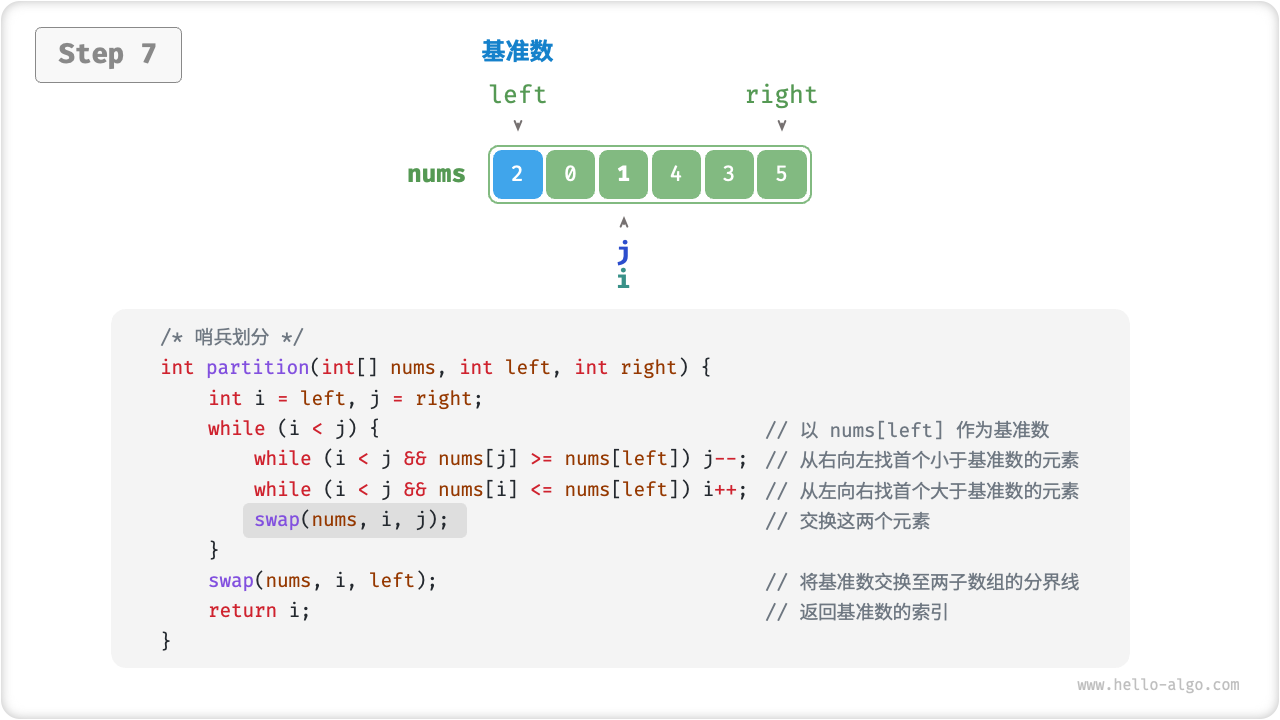 i(j)分别寻找第一个比基准数大(小)的元素,然后交换这两个元素。 - 循环执行步骤