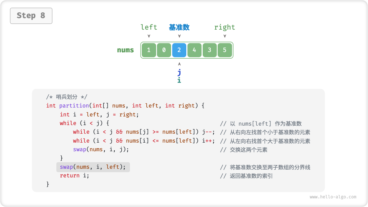 2.,直到i和j相遇时停止,最后将基准数交换至两个子数组的分界线。