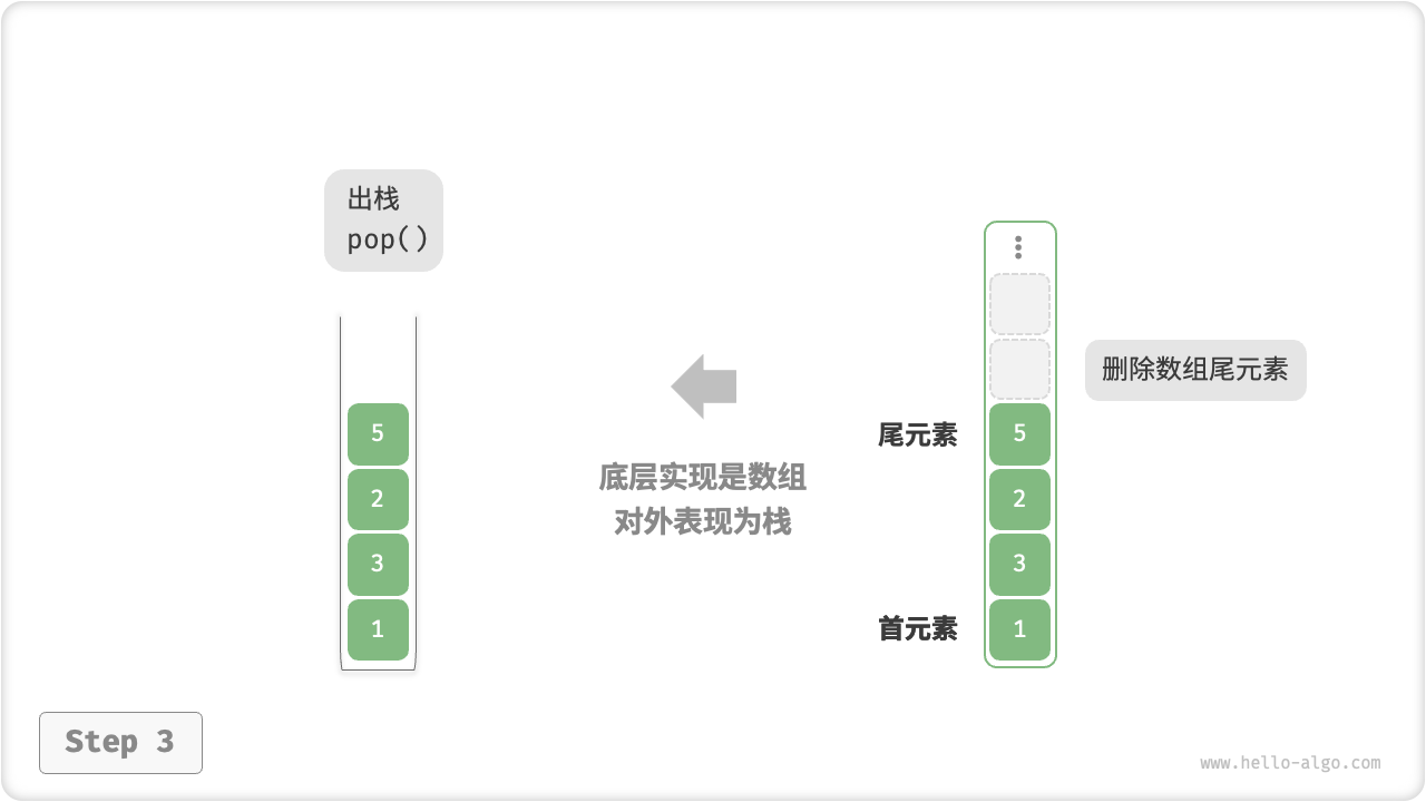 | pop() | 栈顶元素出栈 | \(O(1)\) |